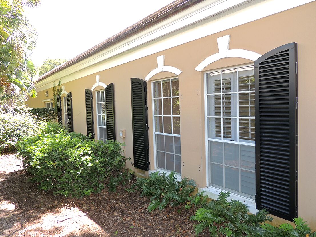 Palm Coast Colonial Shutters offer a classic style that provides an Architectural appeal and ease of use assuring you storm protection and privacy. When open, our custom-fitted Colonial shutters give your home an elegant charm and appeal. They come in both arch and traditional flat topped louvered styles, manufactured with all stainless steel hardware, the shutters themselves are designed using a heavy gauge aluminum extrusion. They are available in a powder coat finish for a long lasting and fade resistant protection.
